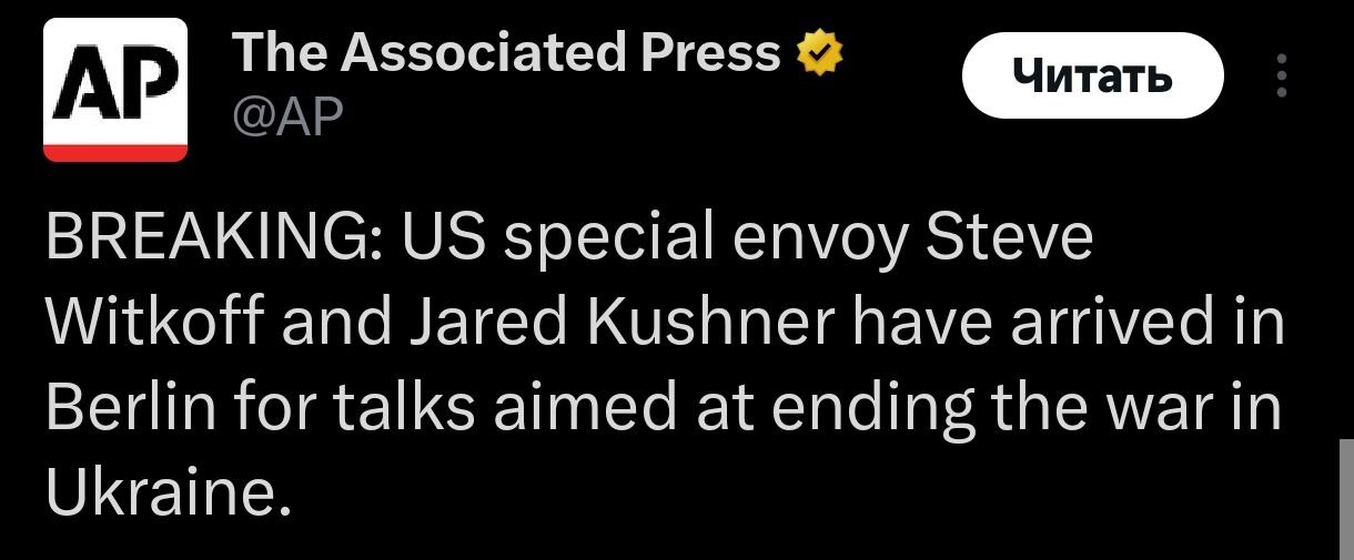 "Стів Віткофф та Джаред Кушнер прибули до Берліна для переговорів, спрямованих на припинення війни в Україні", - йдеться у повідомленні.