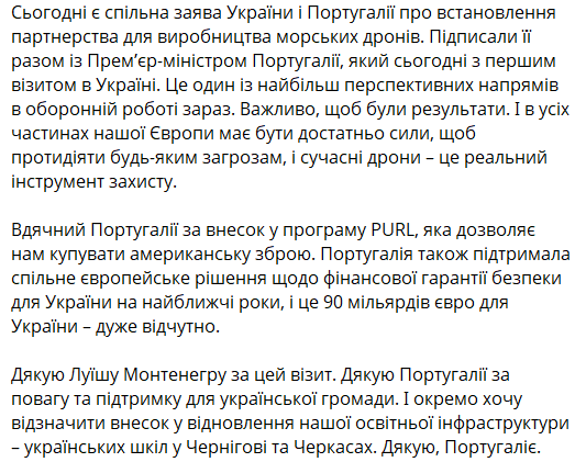 "Завдяки Португалії за внесок у програму PURL, яка дозволяє нам купувати американське озброєння. Португалія також підтримала спільне європейське рішення про фінансові гарантії безпеки для України на найближчі роки, і це 90 мільярдів євро для України - дуже відчутно", - написав Зеленський у своєму телеграм-каналі.