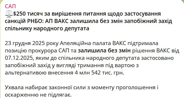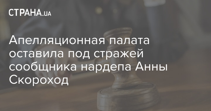 Апеляційна палата ВАКС залишила без змін рішення Вищого антикорупційного суду про запобіжний захід для "спільника" народного депутата Ганни Скороход у вигляді утримання під вартою з альтернативою внесення застави в 4 млн 542 тисяч грн.