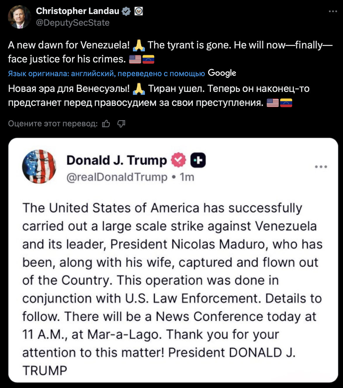 Про це написав заступник державного секретаря США Крістофер Ландау на своїй сторінці у соціальній мережі Х.