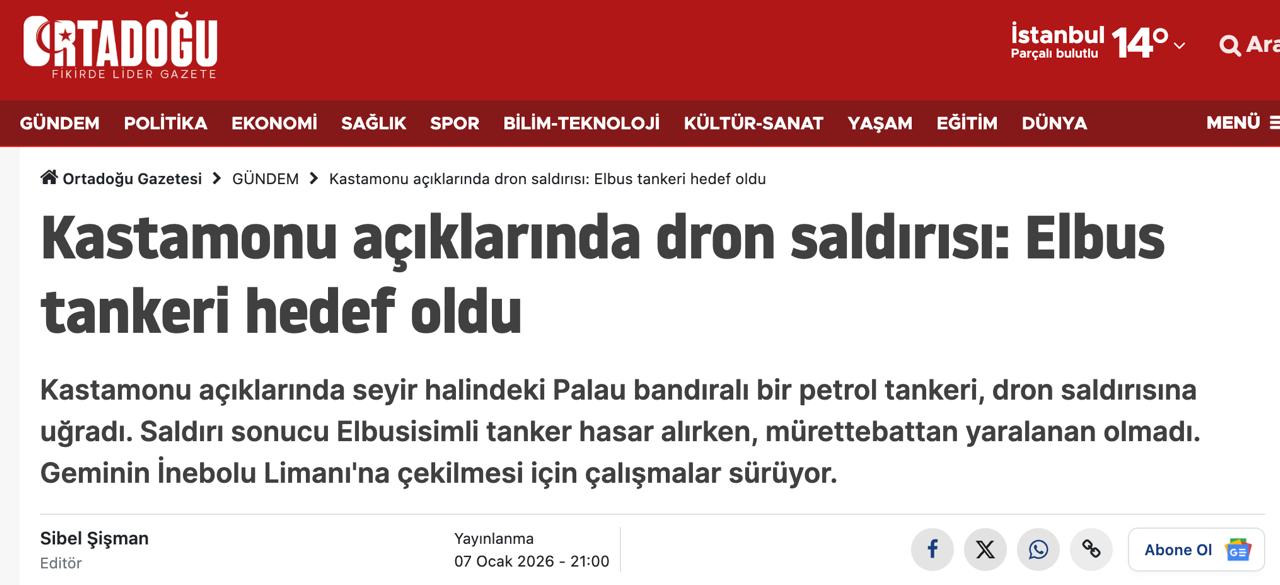 Біля берегів Туреччини поблизу міста Кастамону безпілотник атакував нафтовий танкер "Ельбус" під прапором Палау, який йшов до чорноморського узбережжя Росії. Судно зазнало пошкоджень верхньої частини.
