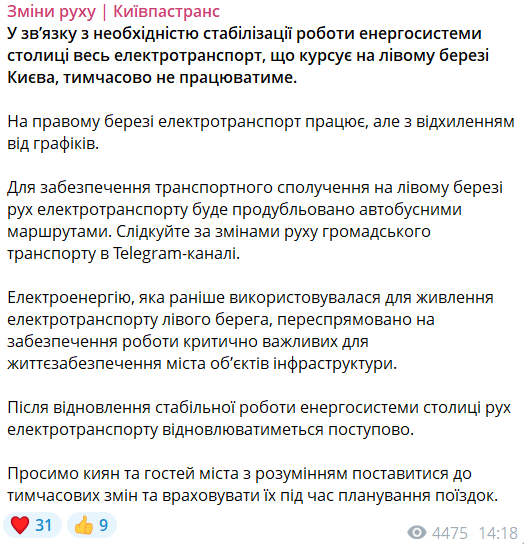 "Електроенергію, яка раніше використовувалася для живлення електротранспорту лівого берега, перенаправлена на забезпечення роботи критично важливих для життєзабезпечення міста об'єктів інфраструктури", - пояснили на підприємстві.