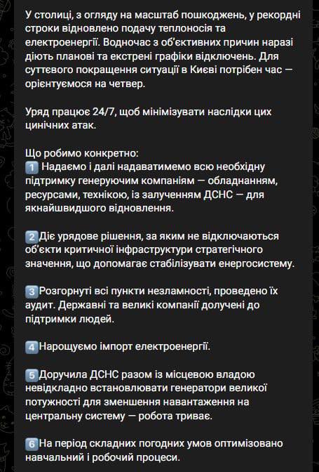 "У столиці, з урахуванням масштабів пошкоджень, у рекордні терміни відновлено подачу теплоносія та електроенергії. При цьому з об'єктивних причин поки діють планові та екстрені графіки відключень. Для суттєвого покращення ситуації в Києві потрібен час - орієнтуємось на четвер", - заявила Свириденко.
