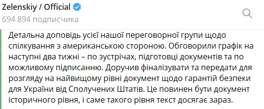 Президент України Володимир Зеленський заявив, що доручив українській делегації фіналізувати та передати для обговорення з головою Білого дому Дональдом Трампом документ про гарантії безпеки США.