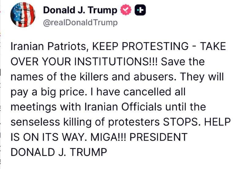 "Іранські патріоти, продовжуйте протестувати, беріть під контроль свої інститути! Зберігайте імена вбивць і тих, хто зловживає владою. Вони заплатять високу ціну. Я скасував усі зустрічі з іранськими офіційними особами до тих пір, поки безглузді вбивства протестувальників не припиняться. Допомога вже в дорозі", - додав він.