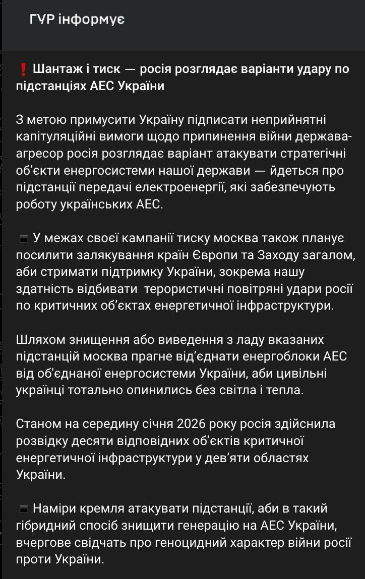 "Шляхом знищення або виведення з ладу зазначених підстанцій Москва прагне від'єднати енергоблоки АЕС від об'єднаної енергосистеми України, щоб українці повністю залишилися без світла і тепла. Станом на середину січня 2026 року Росія провела розвідку десяти відповідних об'єктів критичної енергетичної інфраструктури у дев'яти областях України”, – повідомляє ГУР.