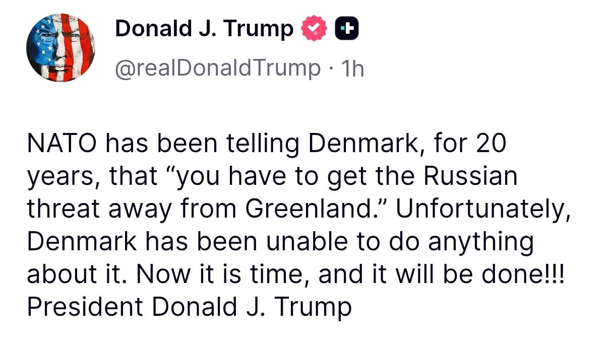 "НАТО протягом 20 років говорила Данії: "Ви повинні усунути російську загрозу в Гренландії". На жаль, Данія не змогла нічого з цим вдіяти. Тепер настав час, і це буде зроблено!" – написав Трамп.