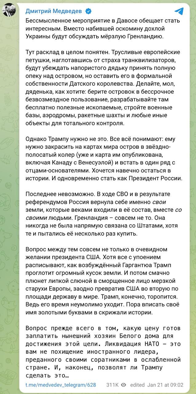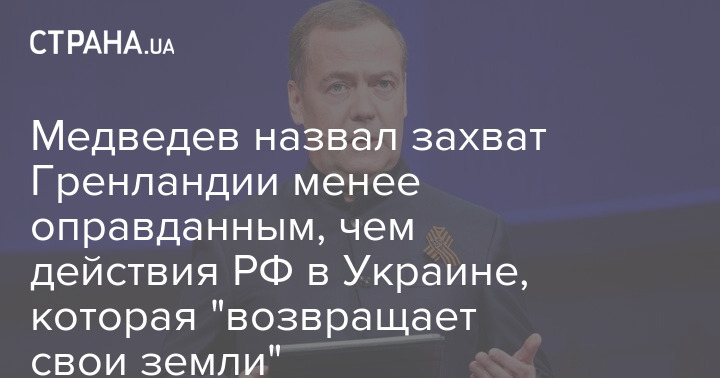 Заступник голови Ради безпеки Російської Федерації Дмитро Медведєв заявив, що захоплення Гренландії американцями буде менш законним, ніж претензії Москви на території України, оскільки Росія повертає собі свої землі, які століттями входили до її складу.