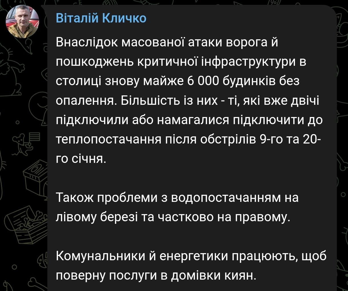 Зазначається, що у Києві після нічного удару знову близько 6.000 будинків без опалення.