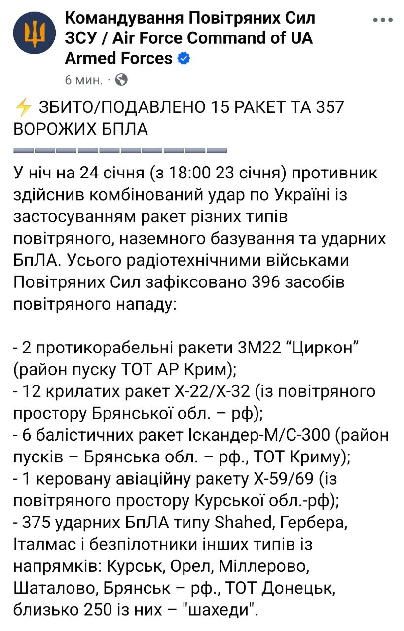 За даними військових, було завдано комбінованого удару. Зафіксовано 396 ракет і дронів, у тому числі - дві протикорабельні ракети "Циркон" (даних про збиття немає), дванадцять крилатих ракет Х-22/Х-32 (збито 9), шість балістичних ракет Іскандер-М/С-300 (збито 5), одну керовану авіаційну 375 ударних безпілотників (збито 357).