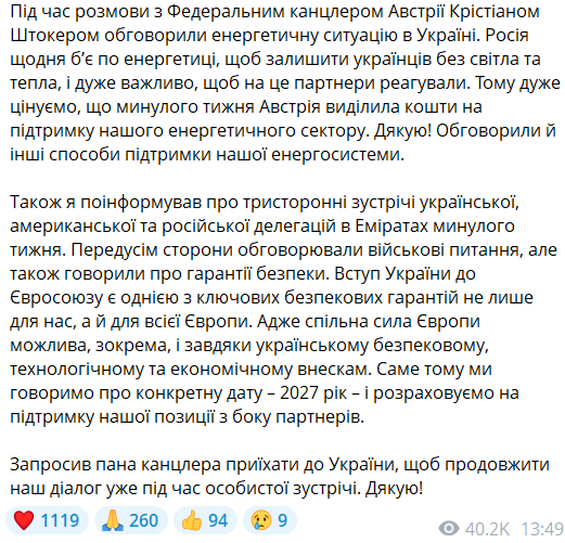 "Дуже цінуємо, що минулого тижня Австрія виділила кошти на підтримку нашого енергетичного сектору. Також я поінформував (Штокера - Ред.) про тристоронні зустрічі української, американської та російської делегацій в Еміратах минулого тижня. Передусім сторони обговорювали військові питання, але також говорили про гарантії безпеки. Вступ України до Євросоюзу є однією з ключових безпекових гарантій не лише для нас, а й для всієї Європи. Адже спільна сила Європи можлива, зокрема, і завдяки українському безпековому, технологічному та економічному внескам. Саме тому ми говоримо про конкретну дату – 2027 рік – і розраховуємо на підтримку нашої позиції з боку партнерів", - написав президент.