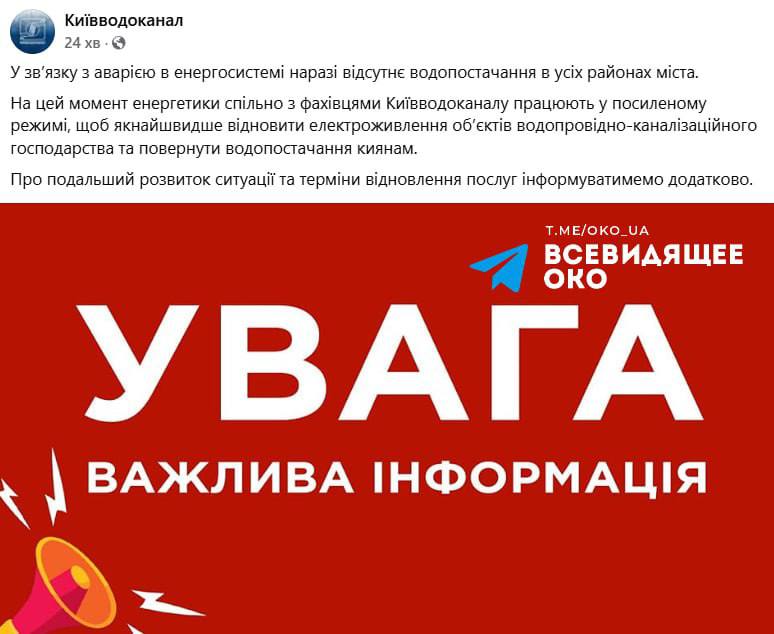 "Наразі енергетики спільно зі спеціалістами Київводоканалу працюють у посиленому режимі, щоб якнайшвидше відновити електроживлення об'єктів водопровідно-каналізаційного господарства та повернути водопостачання киянам. Про подальший розвиток ситуації та терміни відновлення послуг інформуватимемо додатково", - йдеться у повідомленні.