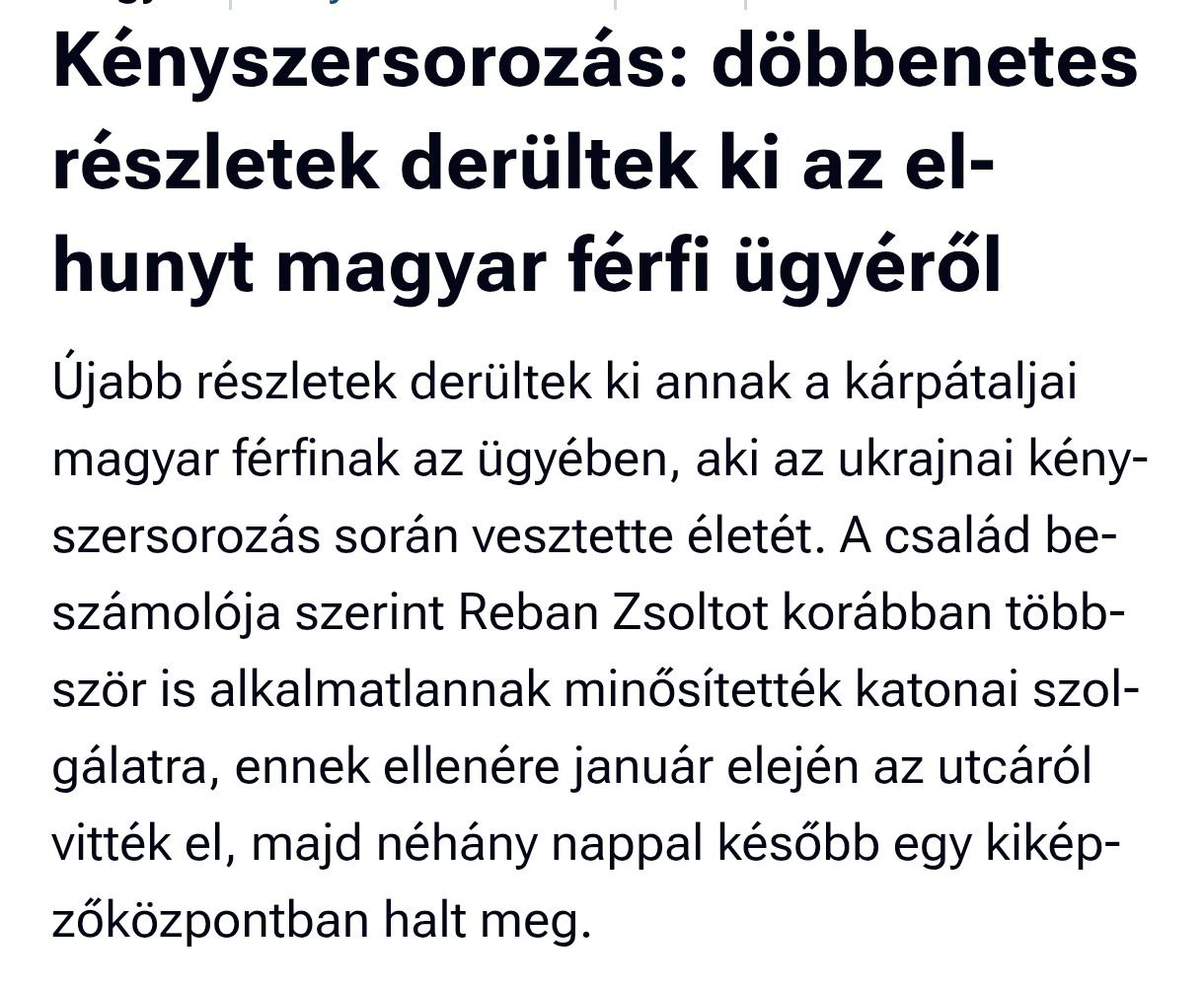 У зв'язку з цим міністр закордонних справ Угорщини Петер Сійярто заявив, що настав час покласти край війні, що розпалюється військовою політикою Брюсселя, і міжнародній спільноті нарешті настав час вжити заходів проти вкрай грубого, відкритого полювання на українців і примусового призову до армії.