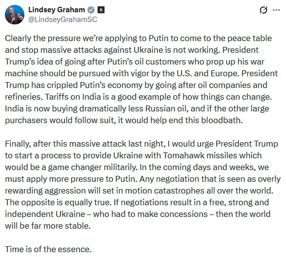 "Очевидно, що тиск, який ми чинимо на Путіна, щоб він сів за стіл переговорів і припинив масовані атаки України, не працює. Ідея президента Трампа про переслідування нафтових клієнтів Путіна, які підтримують його військову машину, має бути енергійно реалізована США і Європою. Нарешті, після цієї масованої атаки минулої ночі я закликав би президента Трампа розпочати процес постачання ракет "Томагавк" Україні, що стало б переломним моментом у військовому відношенні. Найближчими днями та тижнями ми повинні посилити тиск на Путіна. Будь-які переговори, які сприйматимуться як надмірне заохочення агресії, призведуть до катастроф у всьому світі", - заявив сенатор.