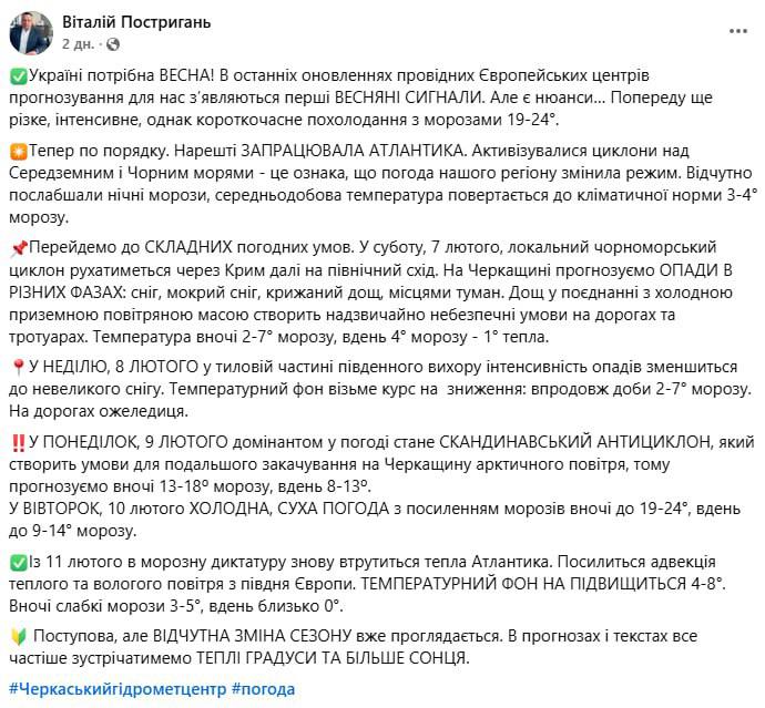 У понеділок 9 лютого домінантом у погоді стане сканднавський антициклон, який створить умови для подальшого закачування на Черкащину арктичного повітря, тож прогнозуємо вночі 13-18º морозу, вдень 8-13º. У вівторок, 10 лютого холодна, суха погода з посиленням морозів вночі до 19-24°, вдень до 9-14° морозу. З 11 лютого морозну диктатуру знову втрутиться тепла Атлантика. Посилиться адвекція теплого та вологого повітря з півдня Європи. Температурний фон підвищиться, підвищиться 4-8°. Вночі слабкі морози 3-5°, вдень близько 0°", - пише Постригань.