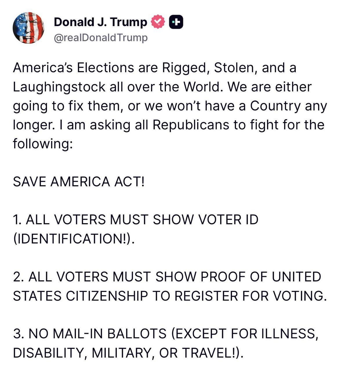За його словами, республіканцям слід схвалити законопроект щодо захисту права виборців на участь у голосуванні. Трамп додав, що законопроект зобов'яже штати підтверджувати громадянство виборців під час реєстрації та зробить обов'язковим пред'явлення посвідчення особи з фотографією перед голосуванням.