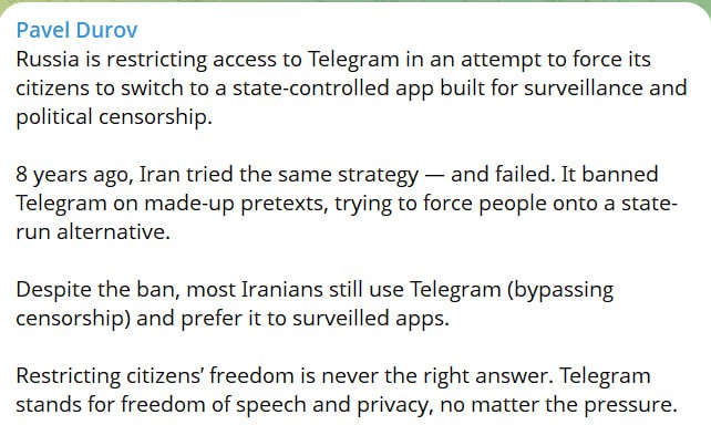 "Росія обмежує доступ до Telegram, намагаючись змусити своїх громадян перейти на контрольований державою додаток, створений для стеження і політичної цензури. Вісім років тому Іран намагався застосувати ту ж стратегію - і зазнав невдачі. Він заборонив Telegram під надуманими приводами, намагаючись змусити людей перейти на державну альтернативу. цензуру) і віддають перевагу його додаткам, які підлягають стеженню. Обмеження свободи громадян ніколи не є правильним рішенням.