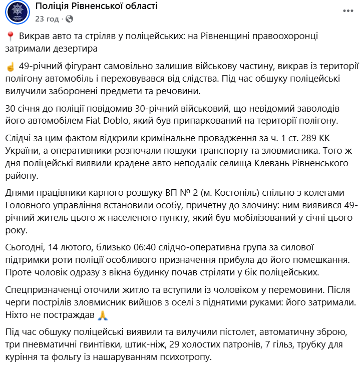 На Рівненщині правоохоронці затримали дезертира, який викрав автомобіль та відкрив вогонь по поліцейських.