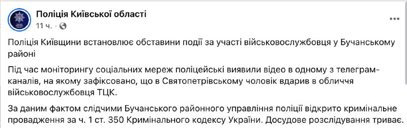 "Поліція Київщини встановлює обставини події за участі військовослужбовця у Бучанському районі. Під час моніторингу соціальних мереж поліцейські виявили відео в одному з телеграм-каналів, на якому зафіксовано, що в Святопетрівському чоловік вдарив в обличчя військовослужбовця ТЦК. За даним фактом слідчими Бучанського районного управління поліції відкрито кримінальне провадження за ч. 1 ст. 350 Кримінального кодексу України. Досудове розслідування триває", - йдеться у повідомленні.
