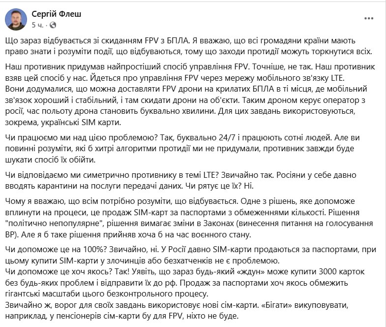 За його словами, росіяни керують своїми FPV-дронами через українські сім-картки, і обмеження їхнього продажу ускладнить для них ситуацію.
