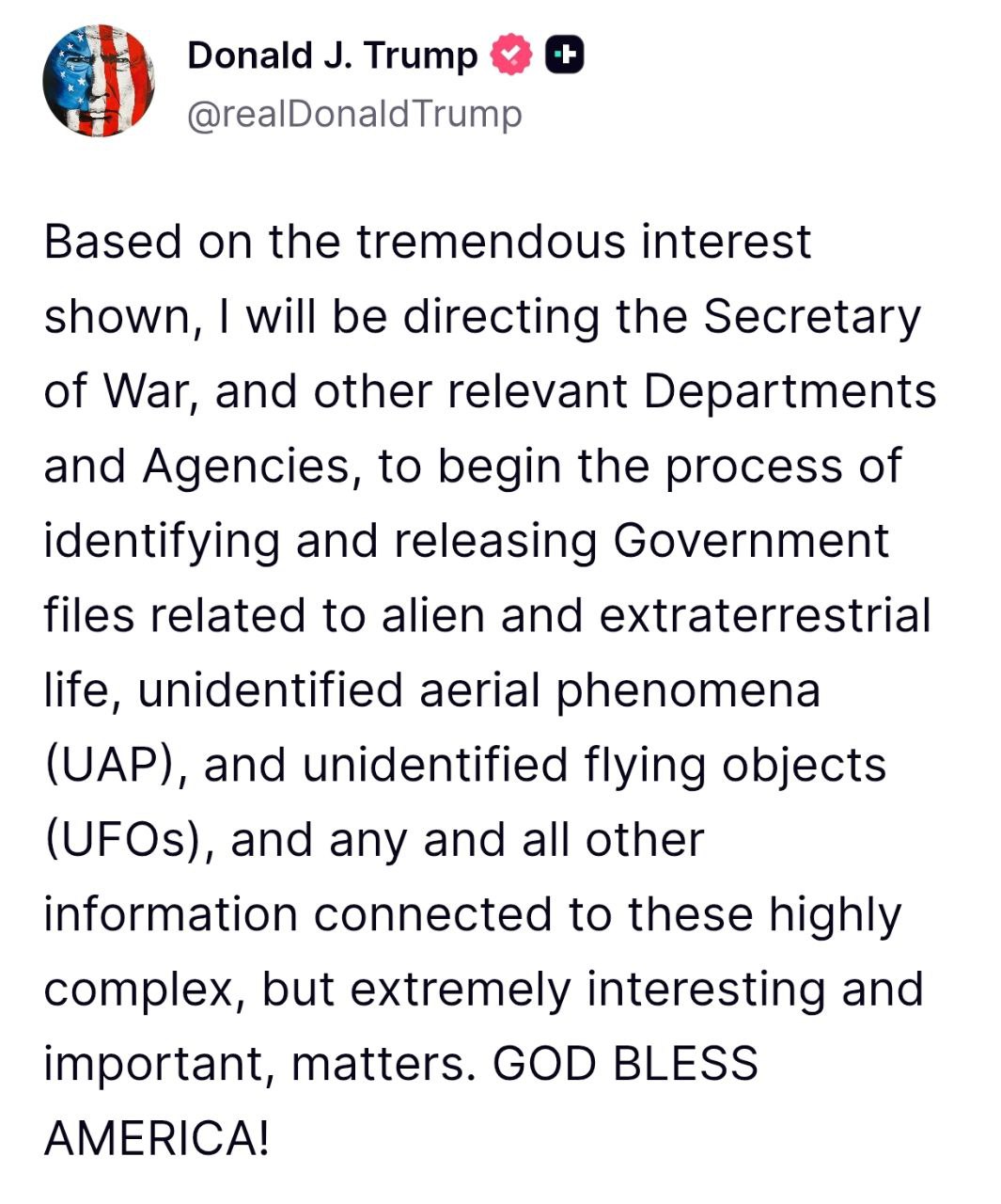 "Я доручу міністру війни та відповідним департаментам та агентствам розпочати процес виявлення та розкриття урядових документів, що стосуються інопланетного та позаземного життя, непізнаних повітряних явищ та непізнаних літаючих об'єктів", - написав глава Білого дому.