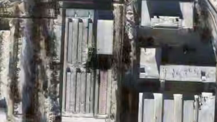На кадрі видно чорний дим, що здіймається над будівлями.