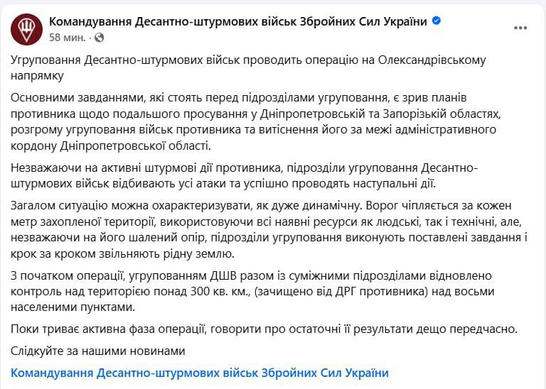 Командування десантно-штурмових військ заявило про контратаки Збройних сил України на Олександрівському напрямку (стик Запорізької та Дніпропетровської області).