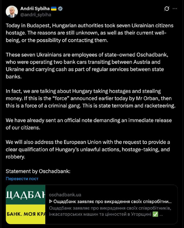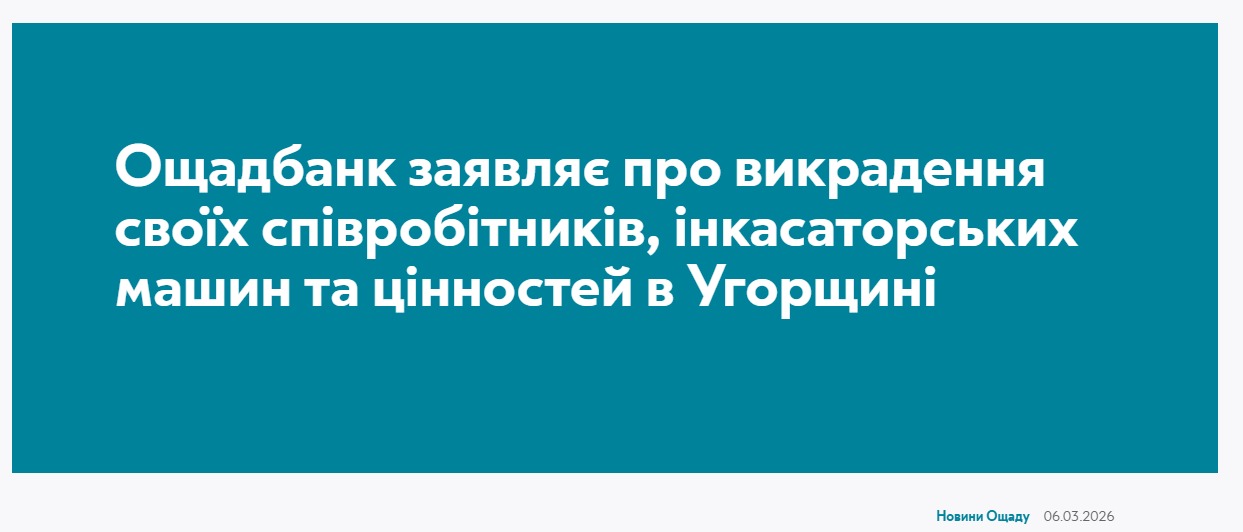 "Два автомобілі інкасаторської служби Ощадбанку, які супроводжувалися 7 співробітниками бригади інкасації, були безпідставно затримані в Угорщині при регулярному перевезенні іноземної валюти і банківських металів між "Райффазен банк Австрія" і Ощадбанком. Згідно з даними GPS-сигналу з сил Будапі, Місцезнаходження автомобілів підтверджено представниками посольства України в Угорщині та Міністерства закордонних справ України. Місцезнаходження співробітників Ощадбанку поки невідоме", - сказано у повідомленні.