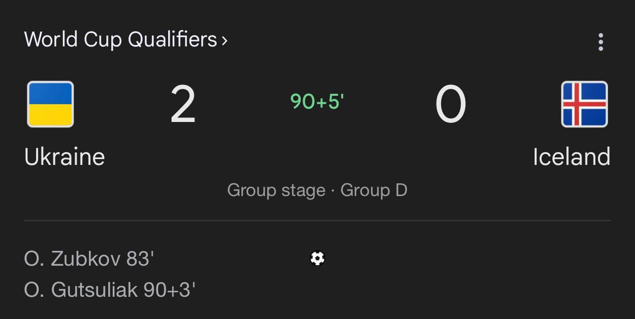 Збірна Ісландії намагалася зрівняти рахунок, але у компенсований арбітром час автор гольової передачі Гуцуляк підбив підсумок зустрічі після удару з-за меж штрафного майданчика - 2:0.